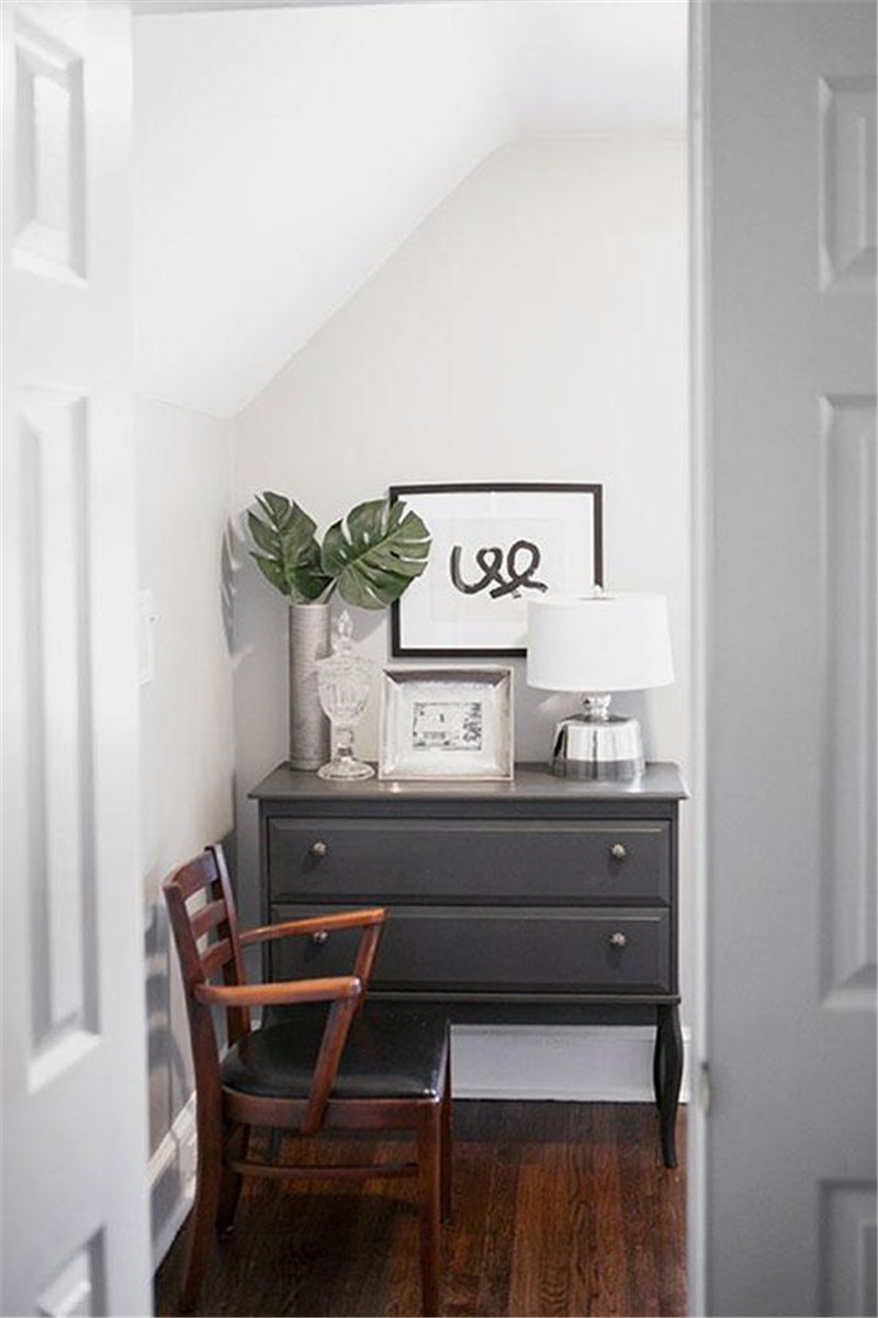房间一角,简约灰色边柜和充满古朴气息的椅子搭配在一起,有着十足的复古韵味。