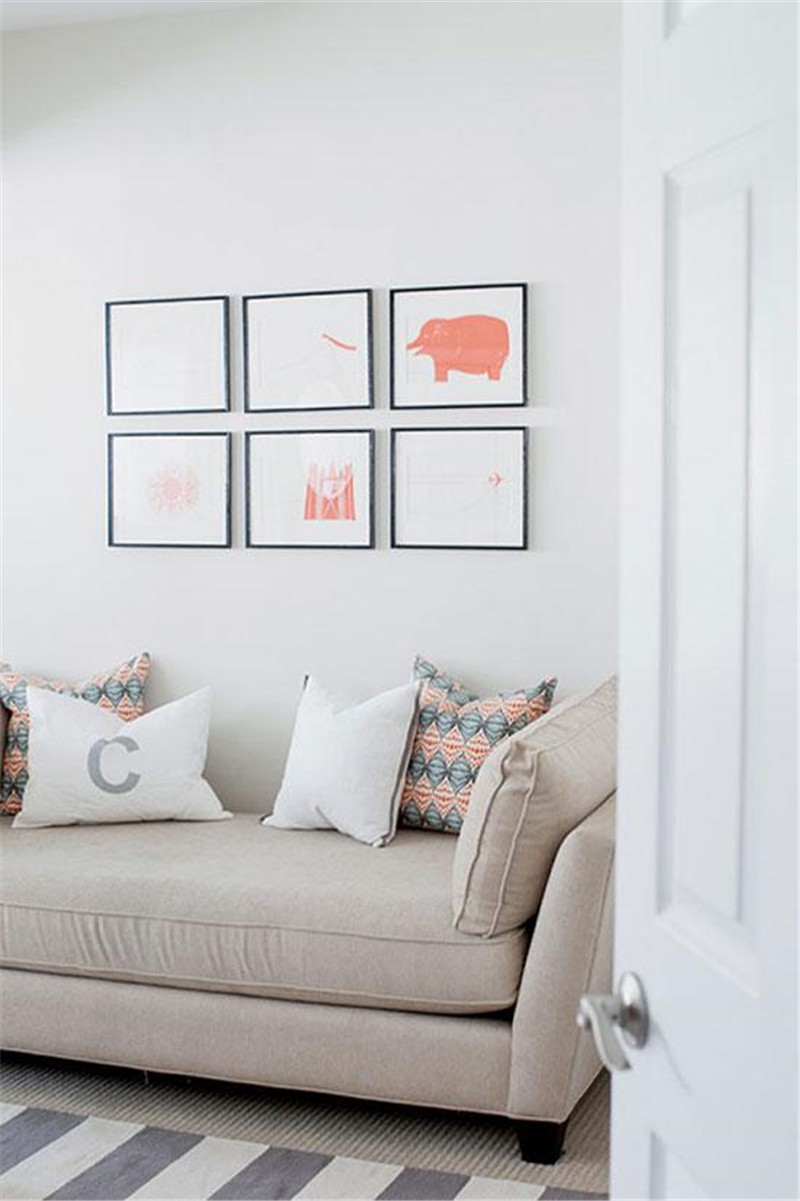 沙发背景墙用卡通装饰画来装饰,充满童趣,不同图案的抱枕也让这个小空间更加活泼而有趣味。