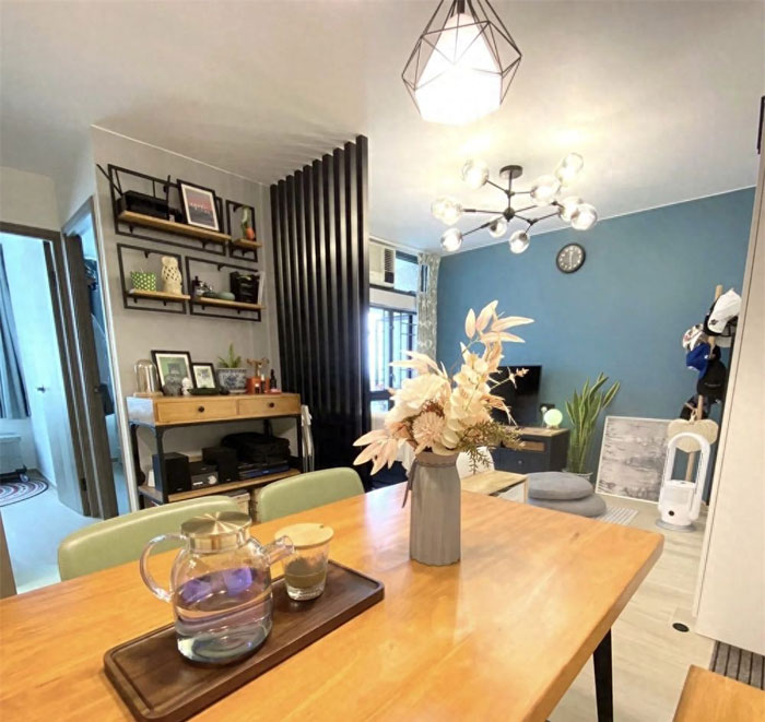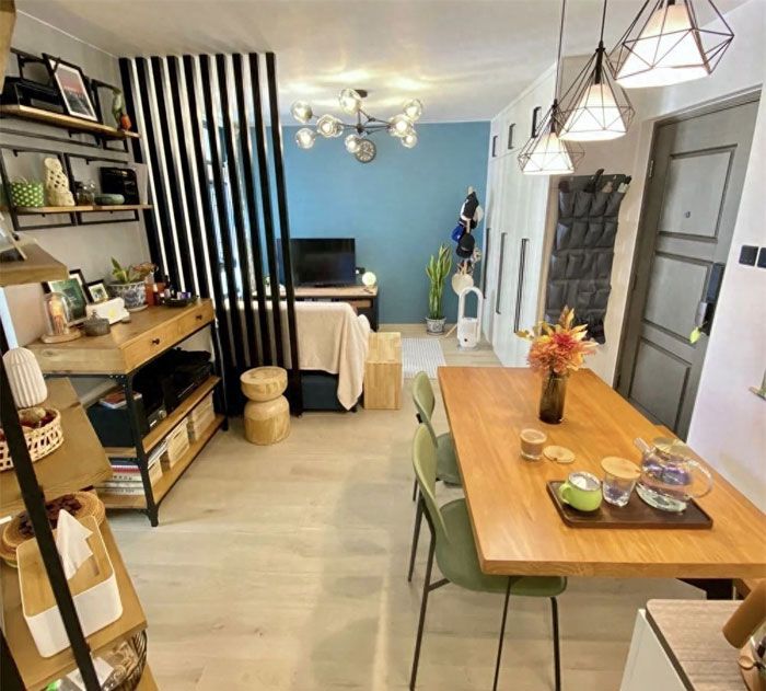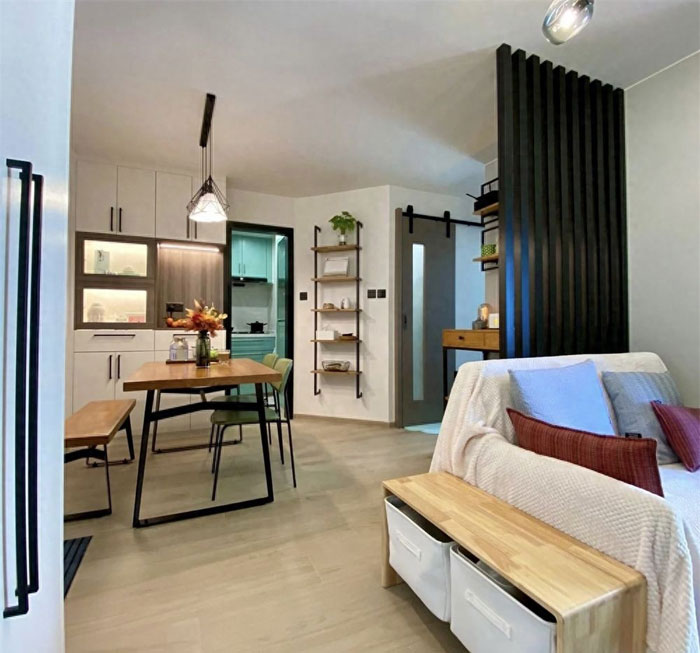 与此同时,餐桌的尺寸刚好合适,既留出了过道空间,又也=完全避开了家里的正门区域,个人感觉布置得还是挺用心的。