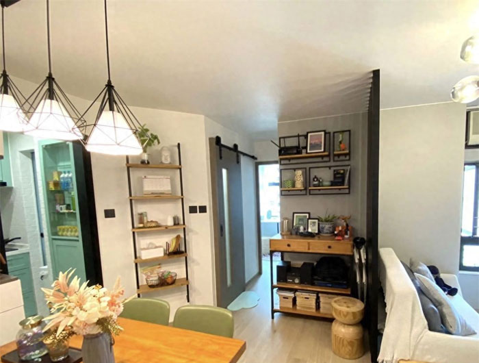进入家中后,是一个客餐厅一体化的空间,再往里走,由封闭式的厨房和卫生间,房间则分成两个,一间是主卧,一间是小面积的多功能房,生活区域一目了然。