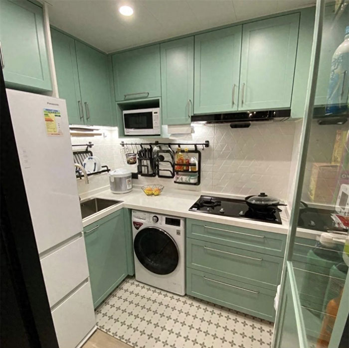 水槽紧挨冰箱,冰箱嵌入柜体,吊柜也恰到好处,这样一间小小的厨房,让我由衷地感到实用和漂亮,真的有些羡慕了~