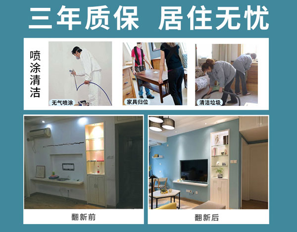 采用高压无气喷涂工艺,漆面更平整光滑,现场清洁,然后进行家居复位,保证客户可以当天直接居住。